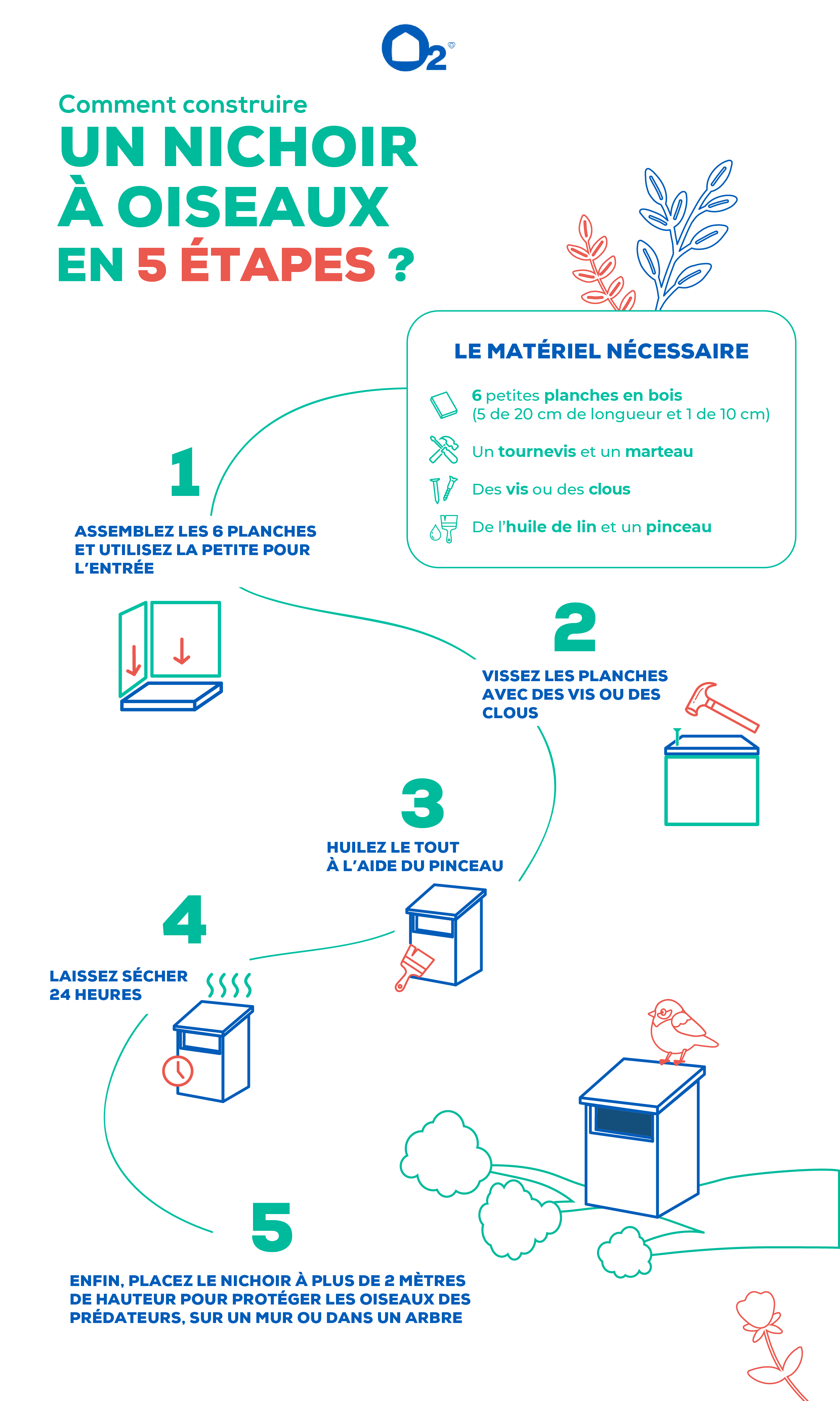 Il est tout à fait possible de fabriquer vous-même votre propre nichoir ! Pour cela, choisissez un bois résistant et imputrescible, comme le cèdre rouge ou le mélèze. Les nichoirs en forme de boîte aux lettres ou de tipi sont assez faciles à réaliser et leur toit permet l’écoulement de l’eau en cas de pluie. Pensez à intégrer une avancée de toit, afin de protéger l’entrée du nichoir. Créez également des aérations, afin que l’air y circule facilement. Pensez à une ouverture qui se manipule facilement, afin de pouvoir le nettoyer à l’automne, après le départ de ses locataires. Et surtout : n’y mettez pas de perchoir, qui pourrait attirer les prédateurs.