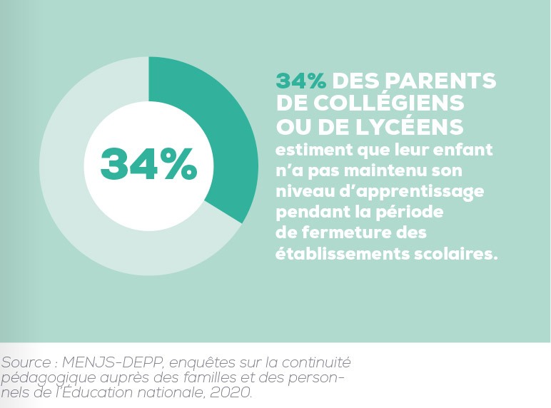 Depuis le premier confinement en mars 2020, la scolarité des enfants est perturbée et les impacts sur l’apprentissage sont visibles : 34% des parents estiment que leurs enfants n’ont pas maintenu leur niveau d’apprentissage pendant la période de fermeture des établissements scolaires.