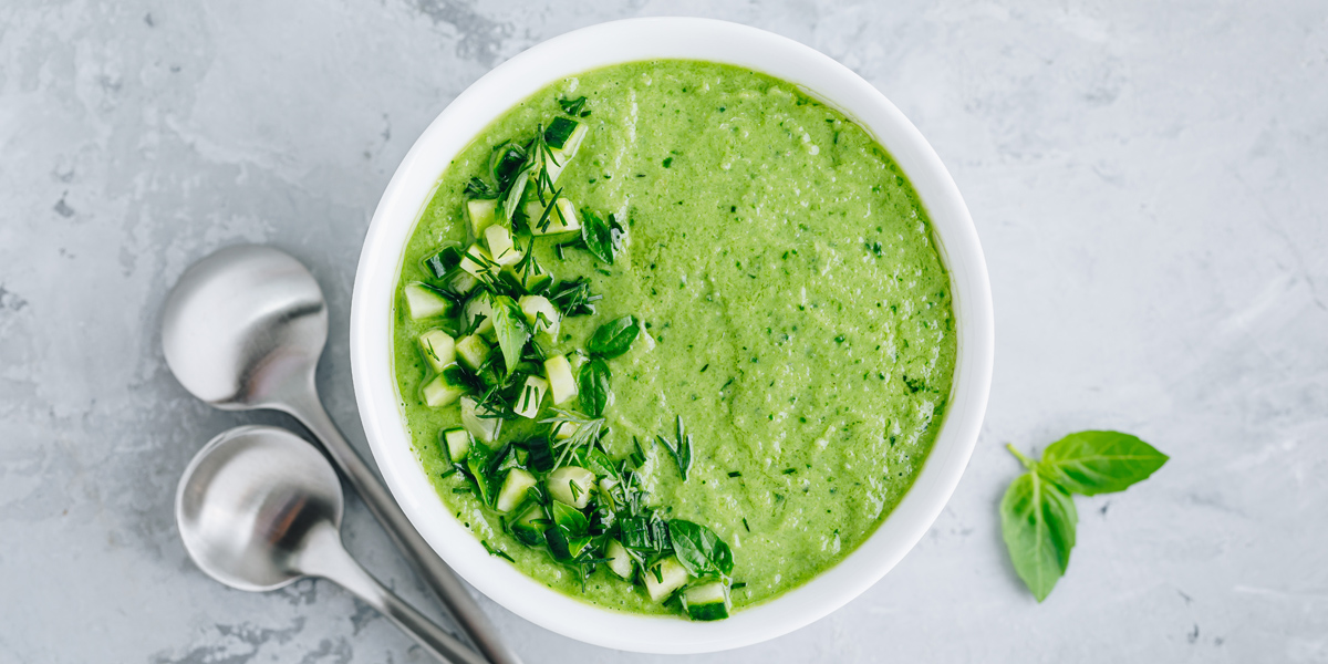 Au blender : mixer ensemble le concombre, les petits pois, la feta, le yaourt et la menthe, puis poivrer et saler