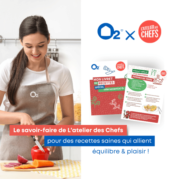 C’est la course toute la semaine et parfois vous avez envie de céder à la tentation de la livraison rapide ? O₂ a fait appel au savoir-faire culinaire de L’atelier des Chefs, un organisme de formations et une équipe de passionnés de cuisine ! Ensemble nous avons mis au point des recettes sur-mesure qui allient simplicité et plaisir, gourmandise et équilibre. Nos aides ménagères peuvent préparer chez vous ces recettes en les adaptant à vos goûts et vos envies. Envie d’un savoir plus sur L’atelier des Chefs : atelierdeschefs.fr